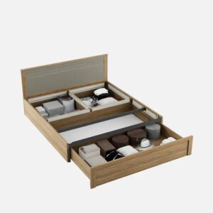The smooth melamine surface is scratch-resistant, moisture-resistant and easy to maintain, ensuring your bed looks new for years. With its sleek design, warm wood tone and functional storage, the Treow Nester bed transforms your bedroom into a stylish, organized and comfortable retreat.